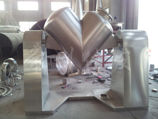 該機(jī)通過機(jī)械傳動(dòng),使不對(duì)稱的V型圓柱體內(nèi)的物料做往復(fù)翻動(dòng),達(dá)到均勻混合之目的。